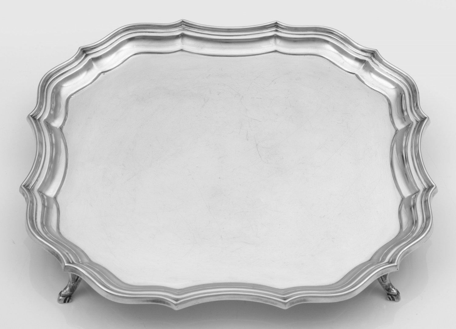 Salver Silber. Von vier hufähnlichen Füßen getragener, glatter Korpus mit passig geschweiftem, profiliertem Rand. Unw. Gebrauchsspuren. Beschaumarken, Ältermannbuchstabe A, Herstellerzeichen. Gew. ca. 612 g. D. 26 cm - 28,5 cm.