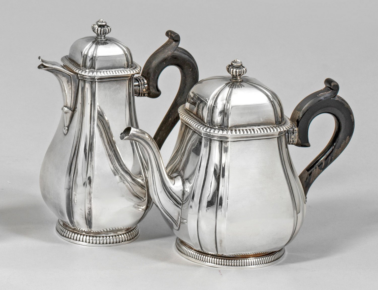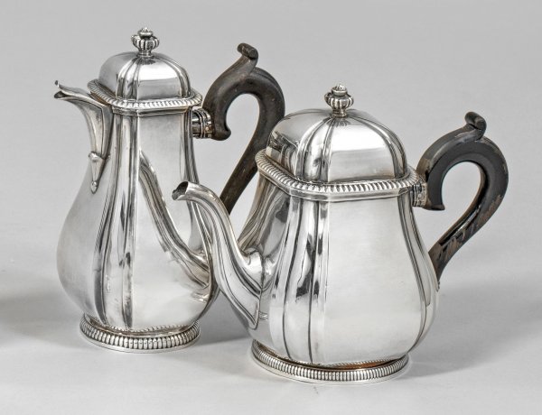 Tee- und Mokkakännchen im Louis XVI-Stil Silber. 2-tlg.; Glatte, gebauchte Form mit senkrechten Godronen, Fuß und Deckel mit Zahnfries abgesetzt. C-förmiger, ebonisierter Holzgriff. Minim. besch.; Gest. Minervakopf, Herstellerzeichen. Gew. zus. ca. 549 g.; H. 13 cm und 14,5 cm.