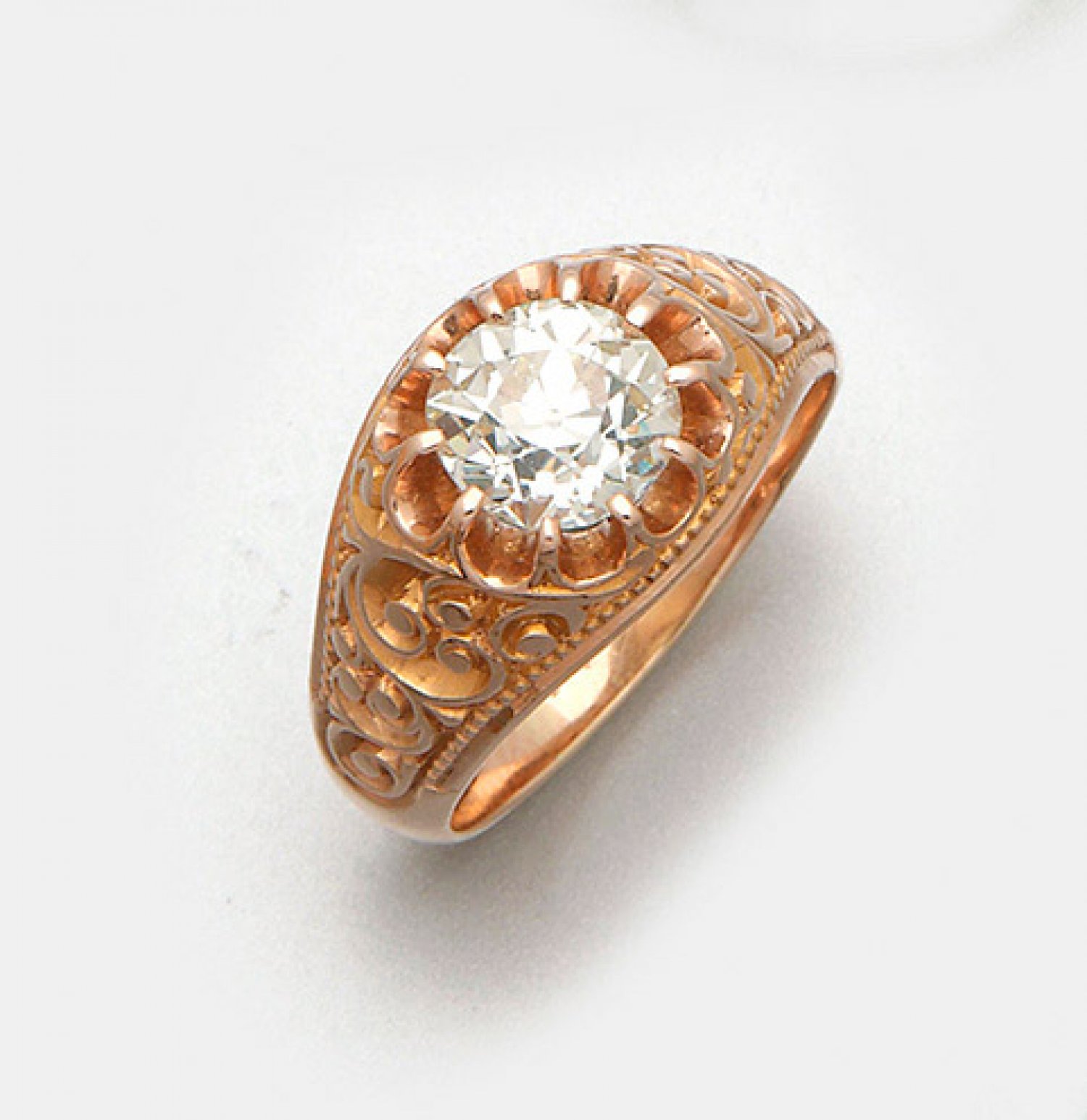 Herrenbandring mit Diamantsolitär aus den 30er Jahren Roségold, 14 ct.; Zentral besetzt mit einem Altschliff-Diamantsolitär von ca. 2,00 ct. (H/vvs), in sog. Kronenfassung. Leicht verlaufende Ringschiene mit erhabenem Blattwerk. Gew. ca. 8,67 g.