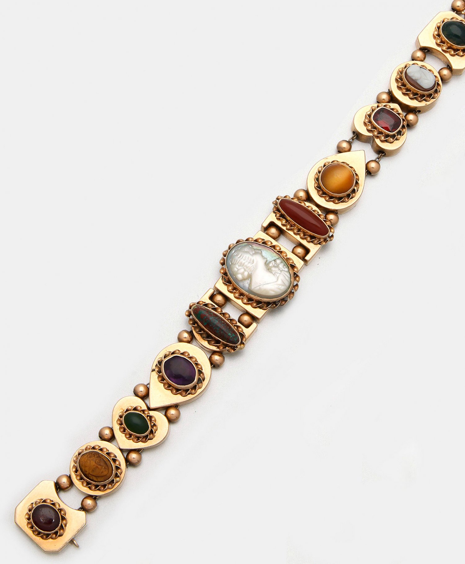Jugendstil Freundschafts-Armband Italien. Um 1900. Gelbgold, gest. 14 ct.; Breite Bandform aus unterschiedlichen teilw. herzförmigen Gliedern, schauseitig besetzt mit Amethysten, Karneol, Tigerauge und Achat im Cabochonschliff sowie Kameen mit unterschiedlichen Frauenporträts im Profil. Gew. ca. 47,62 g.