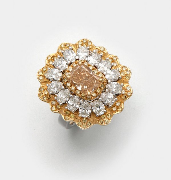 A ring set with one natural fancy brownish orangy yellow diamond approx. 1,68 ct. and numerous white and yellow brilliants approx. 2,49 ct. (F-G/vs), in 18 k white gold. Certificate included.