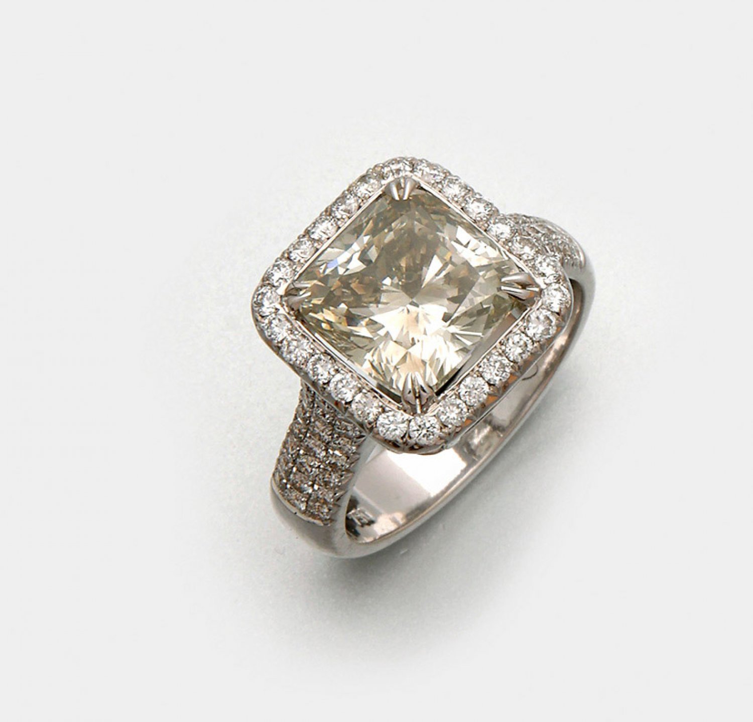 Großer Natural Fancy-Greenish-Yellow-Diamantsolitär Weißgold, gest. 750. Zentral besetzt mit einem Natural Fancy-Greenish-Yellow-Diamanten im Cushionschliff von ca. 5,06 ct. (vs1) in Krappenfassung. Entouriert von diversen kleinen Brillanten von zus. ca. 1,20 ct. (top wesselton (G-H)/vvs-vs).