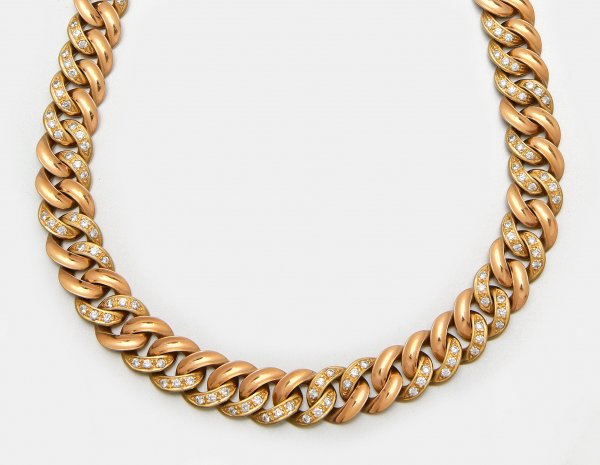 Prachtvolles Panzer-Collier mit Brillanten Gelbgold, gest. 750. Schauseitig besetzt mit Brillanten von zus. ca. 7,35 ct. (H/vs-si). Gew. ca. 244,59 g.; Sehr feine Goldschmiedeausführung.