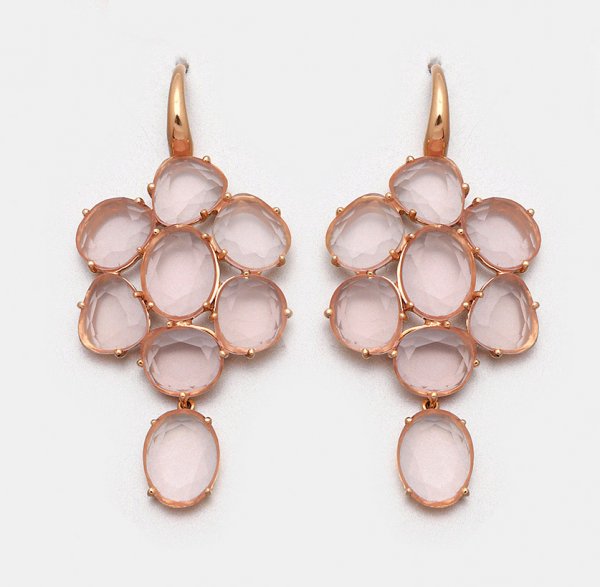 Paar Rosenquarz-Chandeliers von Pomellato aus der Kollektion "Capri". Roségold, gest. 750. Schauseitig besetzt mit pastellfarbenen, facettierten Rosenquarzen. Herstellerzeichen. Original rote Lackbox. Ges.-Gew. ca. 14,19 g.