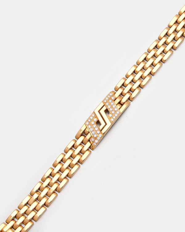 Cocktail-Brillant-Armband von Cartier aus den 80er Jahren Gelbgold, gest. 750. Breites Panthere-Gliederarmband, geometrisch durchbrochenes Mittelstück besetzt mit Brillanten von zus. ca. 1,08 ct. (F-G/vvs). Ref.-Nr. 636613. Herstellerzeichen. Gew. ca. 68,54 g.