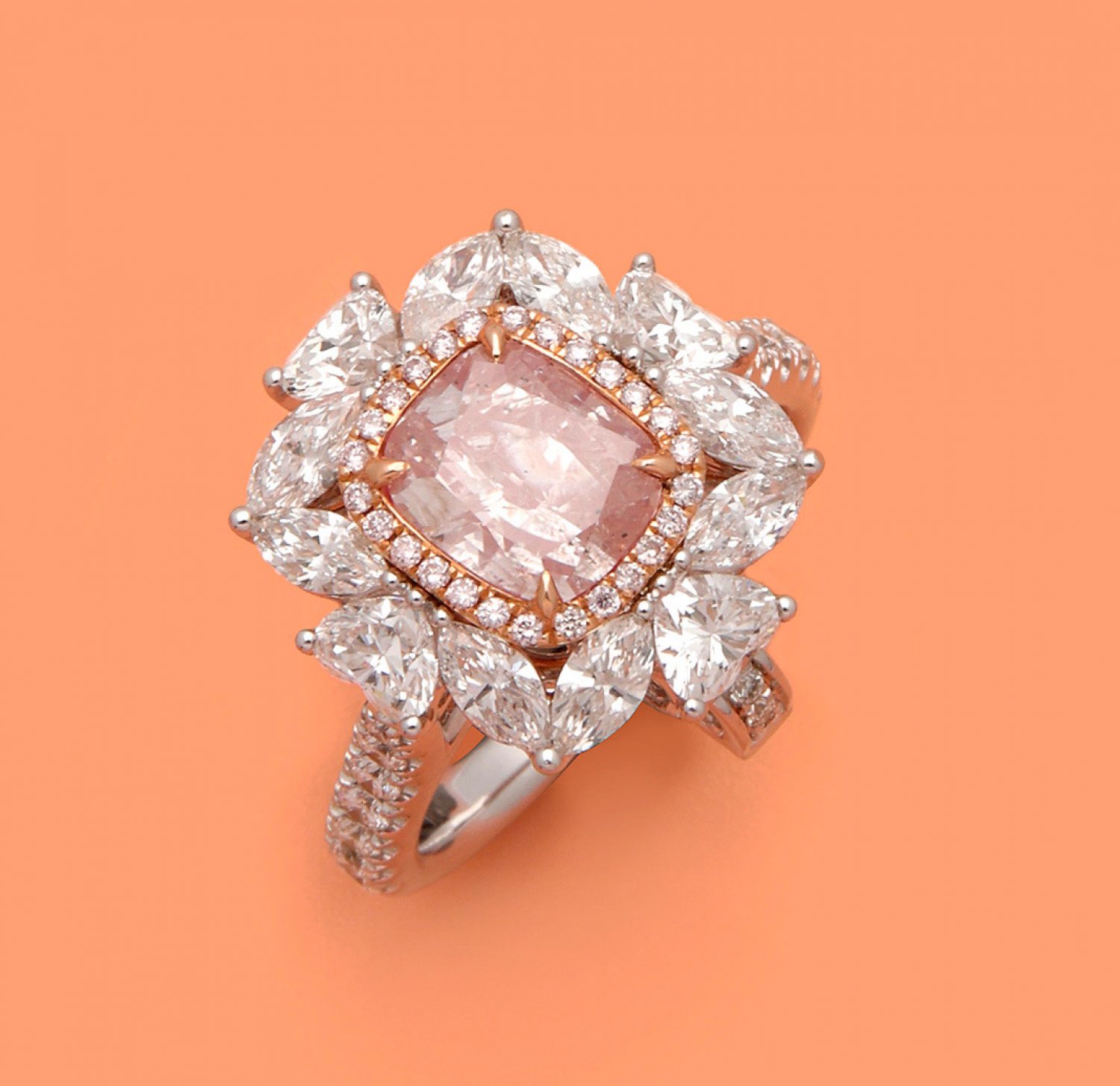 Repräsentativer Juwelenring mit Natural Fancy-Diamanten Weißgold, gest. 750. Zentral besetzt mit einem Natural Fancy-Light-Orangy-Pink-Diamanten von ca. 2,01 ct., entouriert von Diamanten im Herz- und Navetteschliff von zus. ca. 1,70 ct. (H/vs). Gew. ca. 7,78 g. Der Ringkopf ist verwandelbar, so dass der Diamant auch als Anhänger tragbar ist.