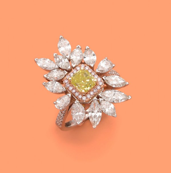 Glamouröser Fancy Canarian-Yellow-Diamantring Weißgold, gest. 750. Zentral besetzt mit einem Fancy Canarian-Yellow-Diamanten von ca. 1,04 ct. im Cushioncut, entouriert von kleinen pinkfarbenen Brillanten von ca. 0,12 ct. und insges. 14 Diamanten im Marquiseschliff von zus. ca. 3,07 ct. (H-K/vs-si); Gew. ca. 9,07 g.