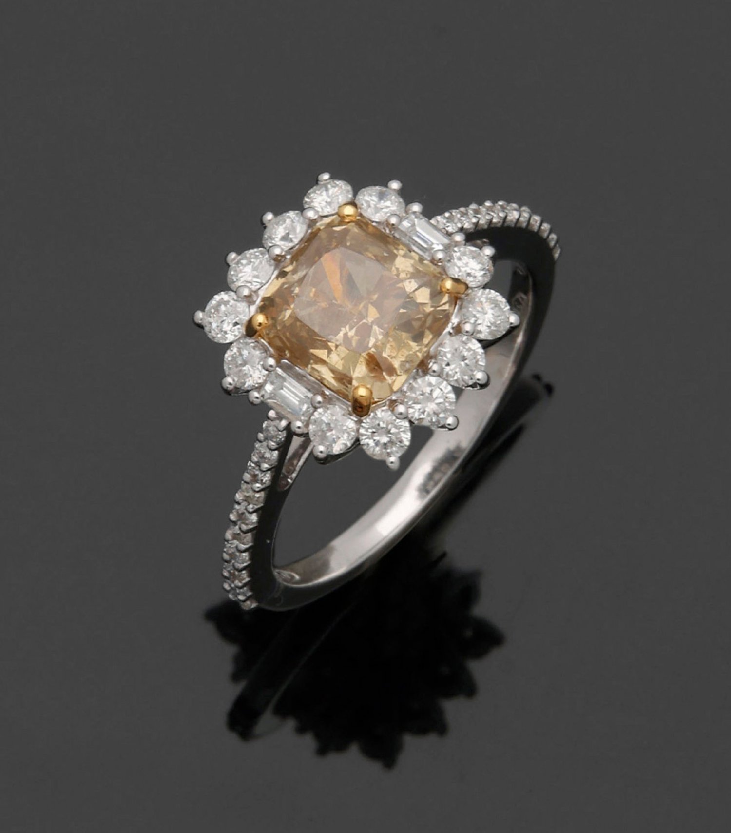 Eleganter Natural Fancy-Brown-Yellow-Diamantring Weißgold, gest. 750. Zentral besetzt mit Natural Fancy-Brown-Yellow-Diamanten von ca. 2,20 ct. entouriert von Brillanten und Diamantbaguetten von zus. ca. 1,44 ct. (H-J/si-pi). Gew. ca. 4,42 g.