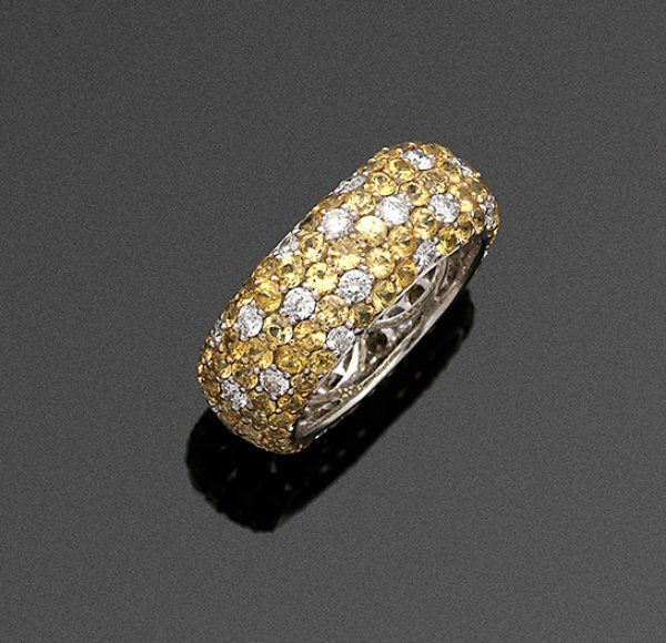 Dekorativer Saphir-Brillant-Bandring Weißgold, gest. 750. Umlaufend besetzt mit kanariengelben Saphiren von zus. ca. 6,28 ct. und Brillanten von zus. ca. 1,10 ct. (G-H/vvs) in Pavéfassung. Gew. ca. 5,79 g.