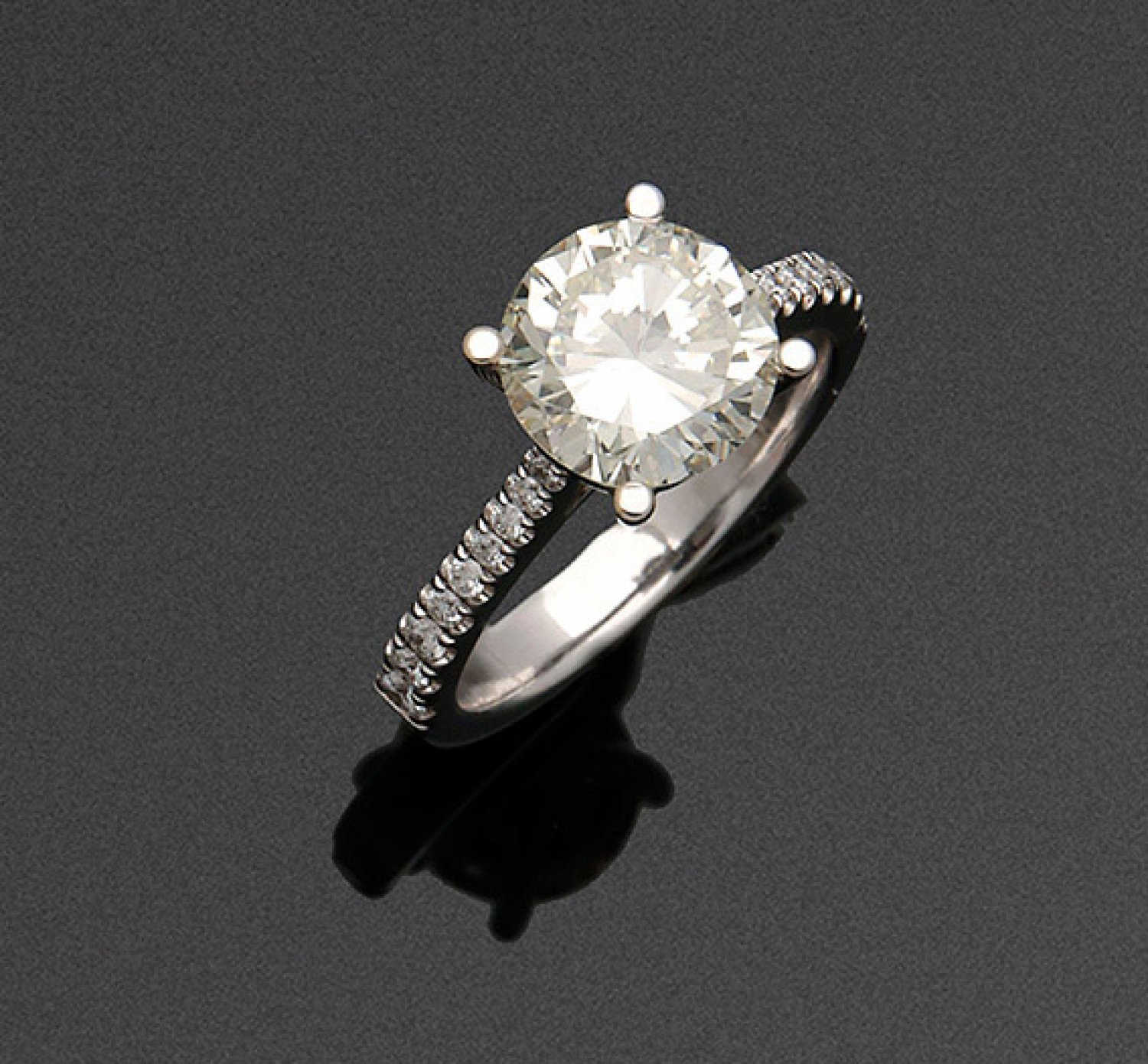 Hochqualitätvoller Brillant-Solitärring Weißgold, gest. 750. Zentral besetzt mit einem Brillanten von ca. 3,00 ct. (K/vvs-vs), flankiert von kleinen Brillanten von zus. ca. 0,40 ct. (H/vs-si). Gew. ca. 5,42 g.