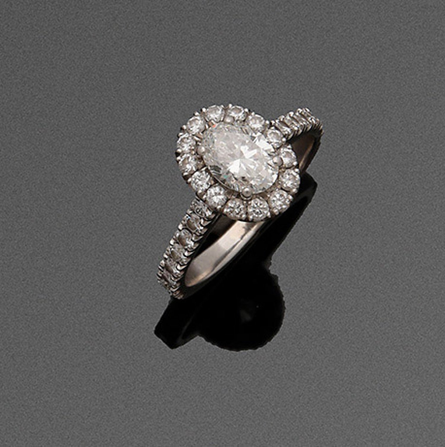 Klassischer Diamant-Solitärring Platin, gest. 950. Zentral besetzt mit einem Diamanten im Ovalschliff von ca. 1,00 ct. (F-G/vvs-vs), entouriert von Brillanten von zus. 1,00 ct. (H-J/si). Gew. ca. 5,57 g.