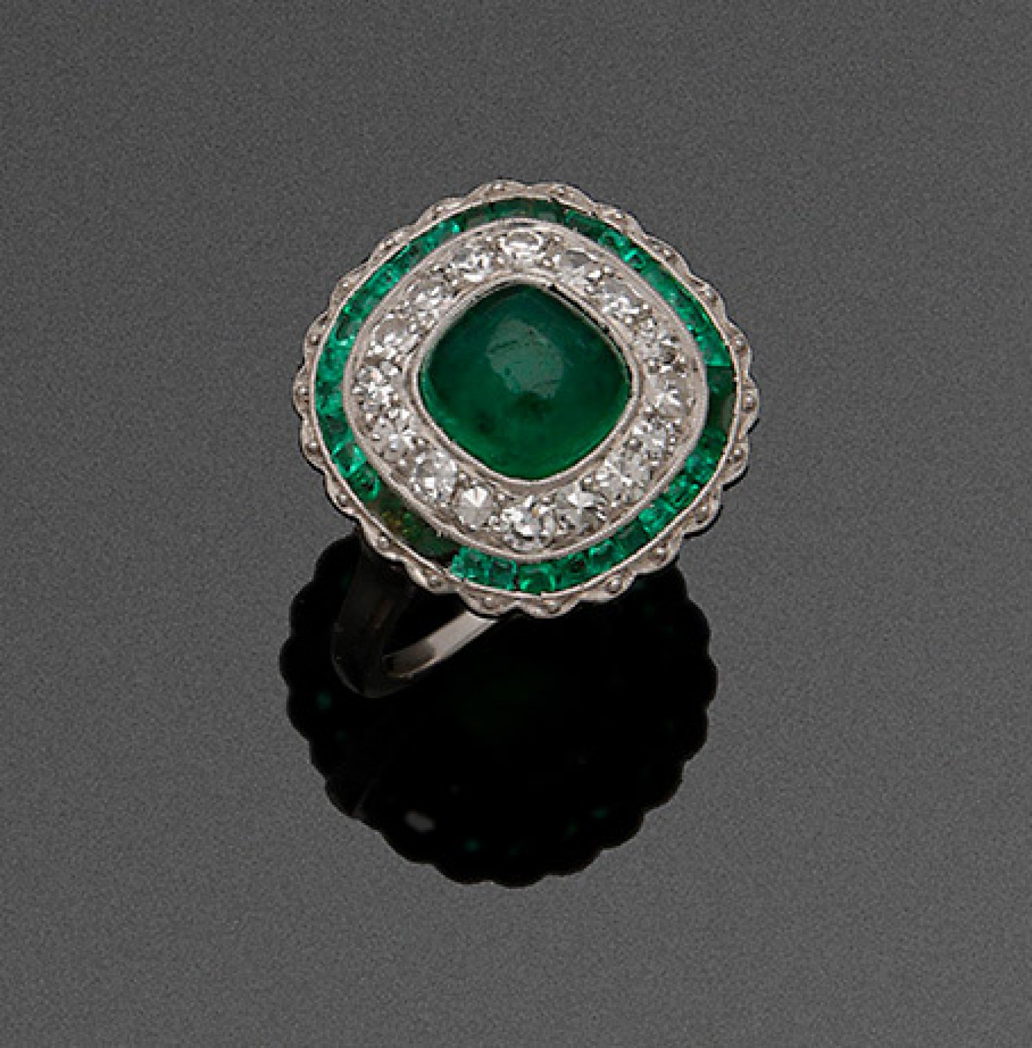 Feiner Art Déco-Smaragdring Platin. Zentral besetzt mit einem leuchtendgrünen kolumbianischen Smaragdcabochon, entouriert von Altschliffdiamanten von zus. ca. 0,80 ct. und kleinen Smaragdcarrees. Gew. ca. 5,41 g.