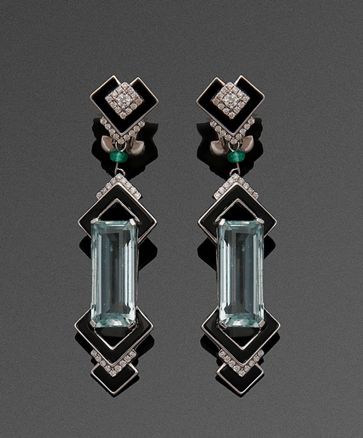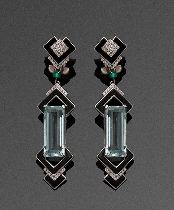 Paar Aquamarin-Ohrgehänge im Art Déco-Stil Weißgold, gest. 750. Teilw. schwarz emailliert. Schauseitig besetzt mit eisblauen Aquamarinen im Tafelschliff von zus. ca. 10,40 ct., akzentuiert durch kleine Brillanten von zus. ca. 0,40 ct. (H/vs). Ges.-Gew. ca. 10,76 g.