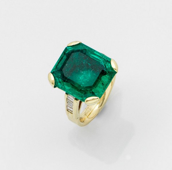 Spektakulär großer kolumbianischer Smaragdring Gelbgold, gest. 750. Zentral besetzt mit einem leuchtendgrünen "Vivid green" Smaragd von ca. 18,35 ct. mit sehr feinem Jardin, flankiert von Diamanten im Baguetteschliff von zus. ca. 0,35 ct. (F-G/vvs1). Gew. ca. 15,14 g.