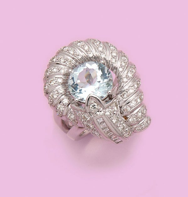 Repräsentativer Aquamarin-Ring Weißgold, gest. 750. Zentral besetzt mit einem himmelblauen Aquamarin von ca. 4,00 ct., entouriert von Brillanten von zus. ca. 2,00 ct. (F-G/vvs). Gew. ca. 19,65 g.