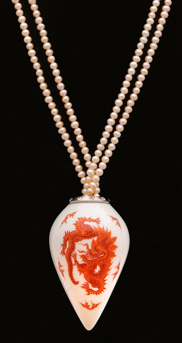 Limitierte Perl-Sautoire mit Meissen-Anhänger-"Roter Drache" von Gaby Wandscher"