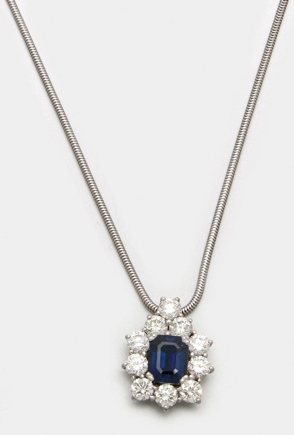 Glamouröse Kette mit Saphir-Brillant-Anhänger Weißgold, gest. 750. Zentral besetzt mit einem royalblauen Saphir von ca. 5,40 ct. im Tafelschliff, entouriert von zehn Brillanten von zus. 4,50 ct. (G-H/vsi-si). Dazu feine Schlangenhautkette. Ges.-Gew. ca. 20,30 g.