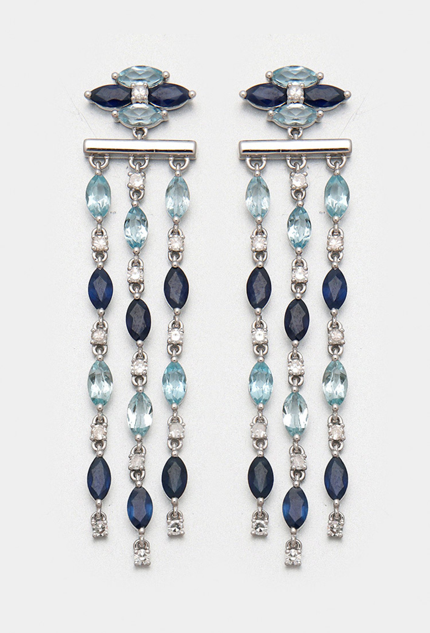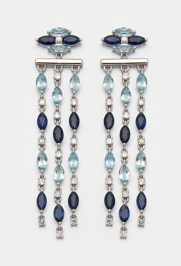 A pair of chandeliers set with sapphires approx. 5,60 ct., aquamarines approx. 3,98 ct. and diamonds approx. 0,87 ct. (H/vvs), in 18 k white gold.