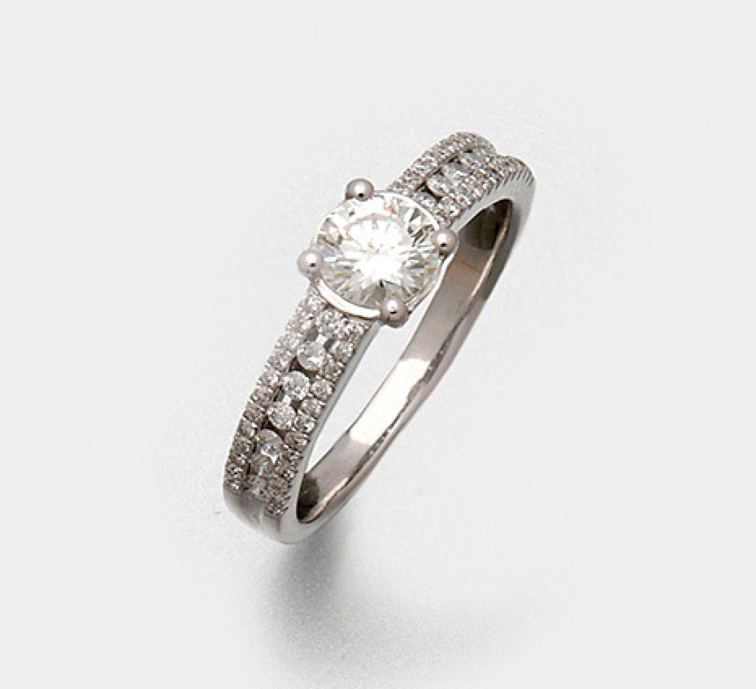 A ring set with one brilliant solitaire approx. 0,30 ct. (F/vvs) and small diamonds approx. 0,50 ct. (F/vs1), in 18 k white gold.