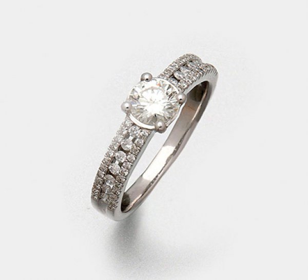 Eleganter Brillant-Solitärring Weißgold, gest. 750. Zentral besetzt mit einem Brillanten von ca. 0,30 ct. (top wesselton(F)/vvs), begrenzt von kleinen Brillanten von zus. ca. 0,50 ct. (top wesselton(F)vs1). Sehr feine Goldschmiedeausführung in Ajour. Gew. ca. 3,81 ct.
