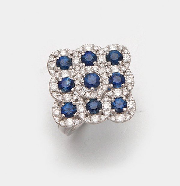 A ring set with royal blue Ceylon sapphires approx. 10,00 ct. and diamonds approx. 1,05 ct. (F-G/vs), in 18 k white gold.