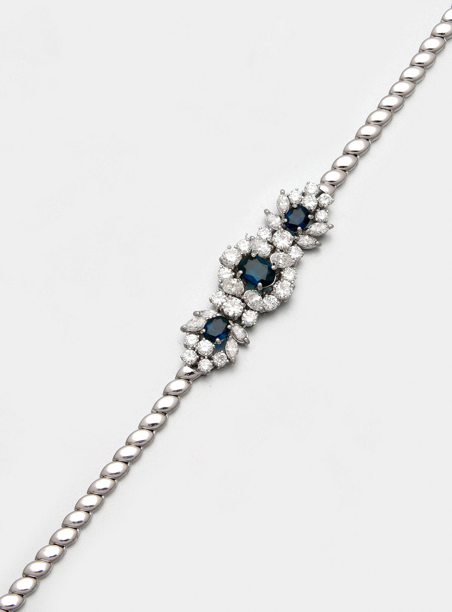 Prachtvolles Saphir-Brillantarmband Weißgold, gest. 750. Schauseitig besetzt mit drei tintenblauen Saphiren im Ovalschliff von zus. ca. 2,90 ct., umrahmt von Brillanten sowie Diamanten im Tropfen- und Marquiseschliff von zus. ca. 4,00 ct. (G-H/vs2-si1). Gew. ca. 24,57 g. Wiederbeschaffungswert ca. € 14.200,-.
