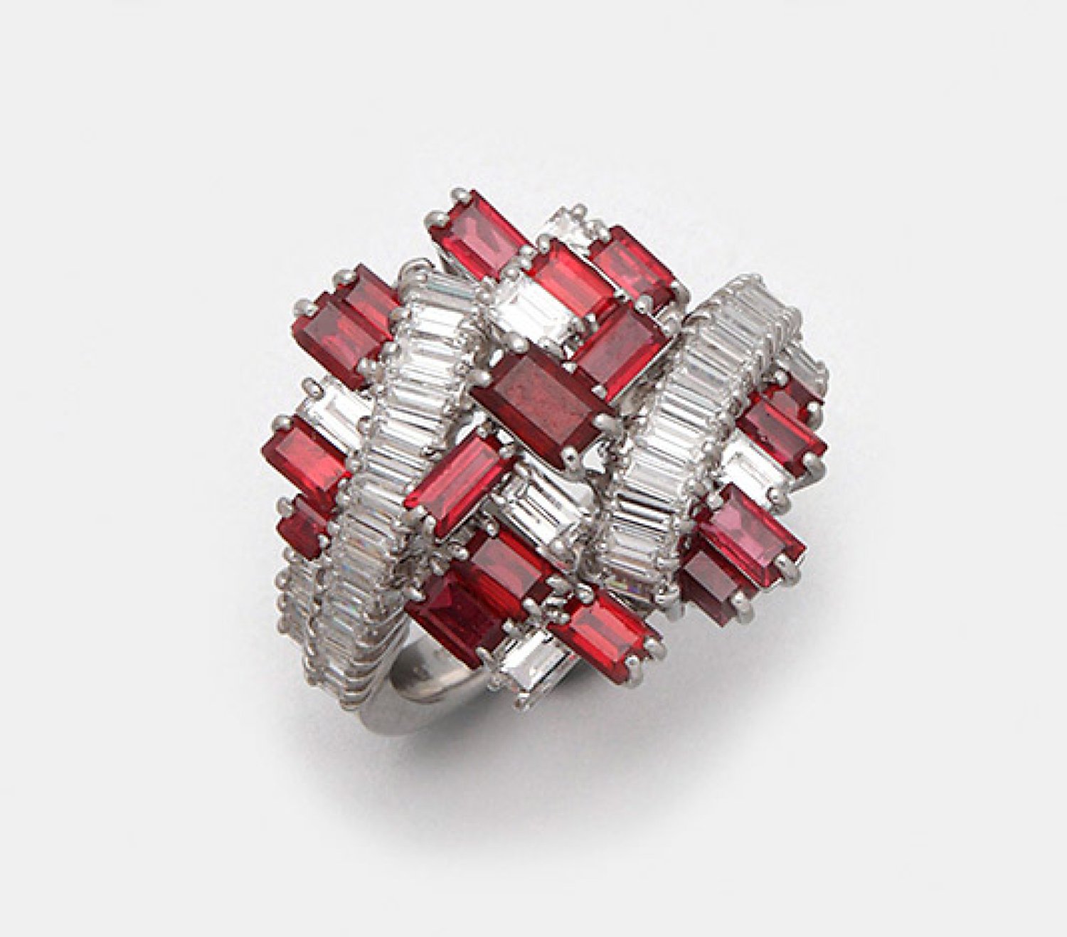 A ring set with natural pigeon blood red rubies approx. 2,41 ct. and diamonds approx. 1,76 ct. (F-G/vvs), in 18 k white gold.