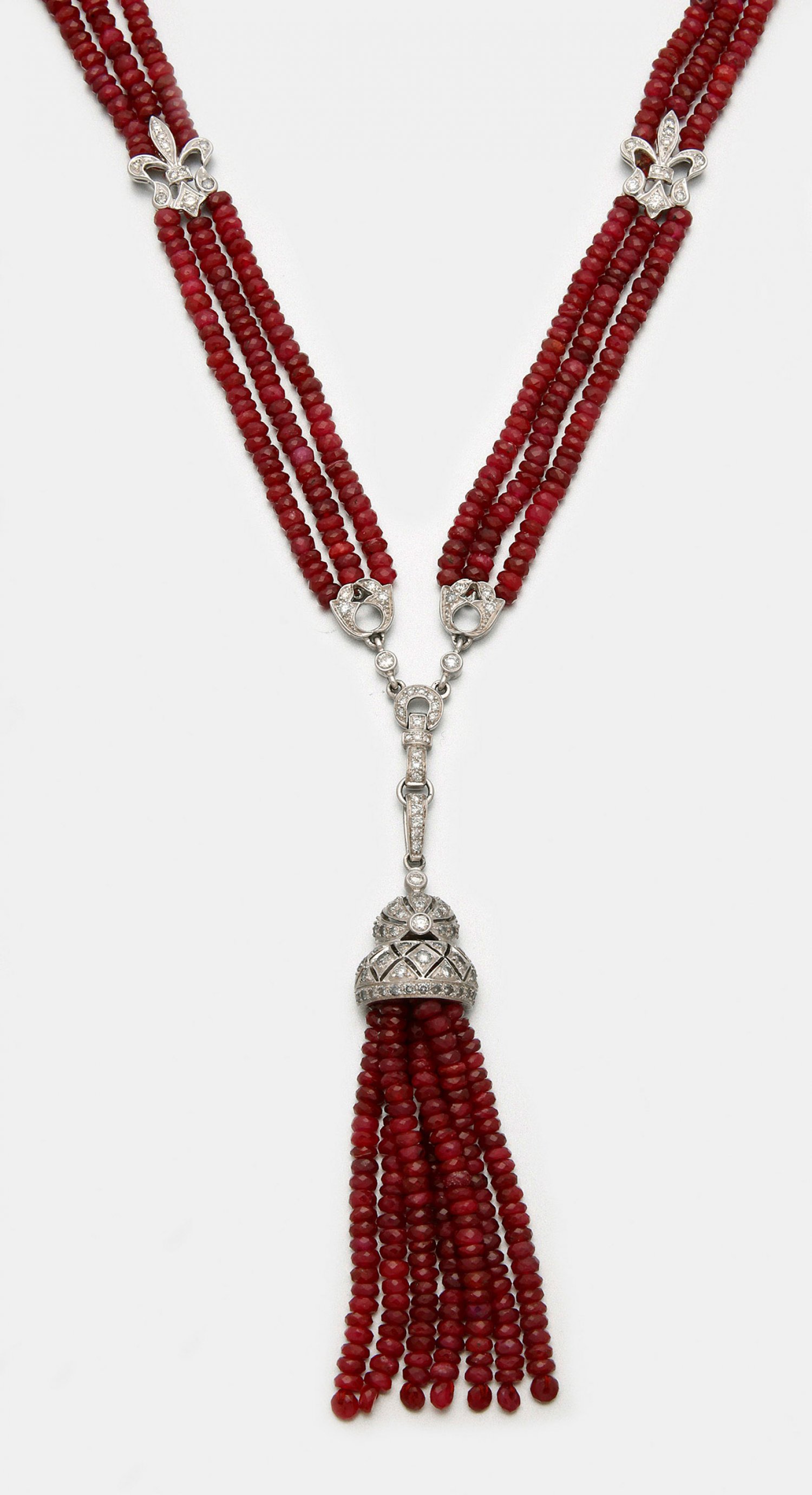 Glamouröses Rubin-Collier im Stil von Cartier der 20er Jahre Weißgold, gest. 750. Dreireihige Kette und abschließender quastenförmiger Anhänger aus taubenblutroten, facettierten Rubinperlen von zus. ca. 170 ct., unterteilt durch fein ornamentierte Glieder, besetzt mit Diamanten von zus. ca. 1,40 ct. (H/vs) in Ajour. Gew. ca. 48,24 g.