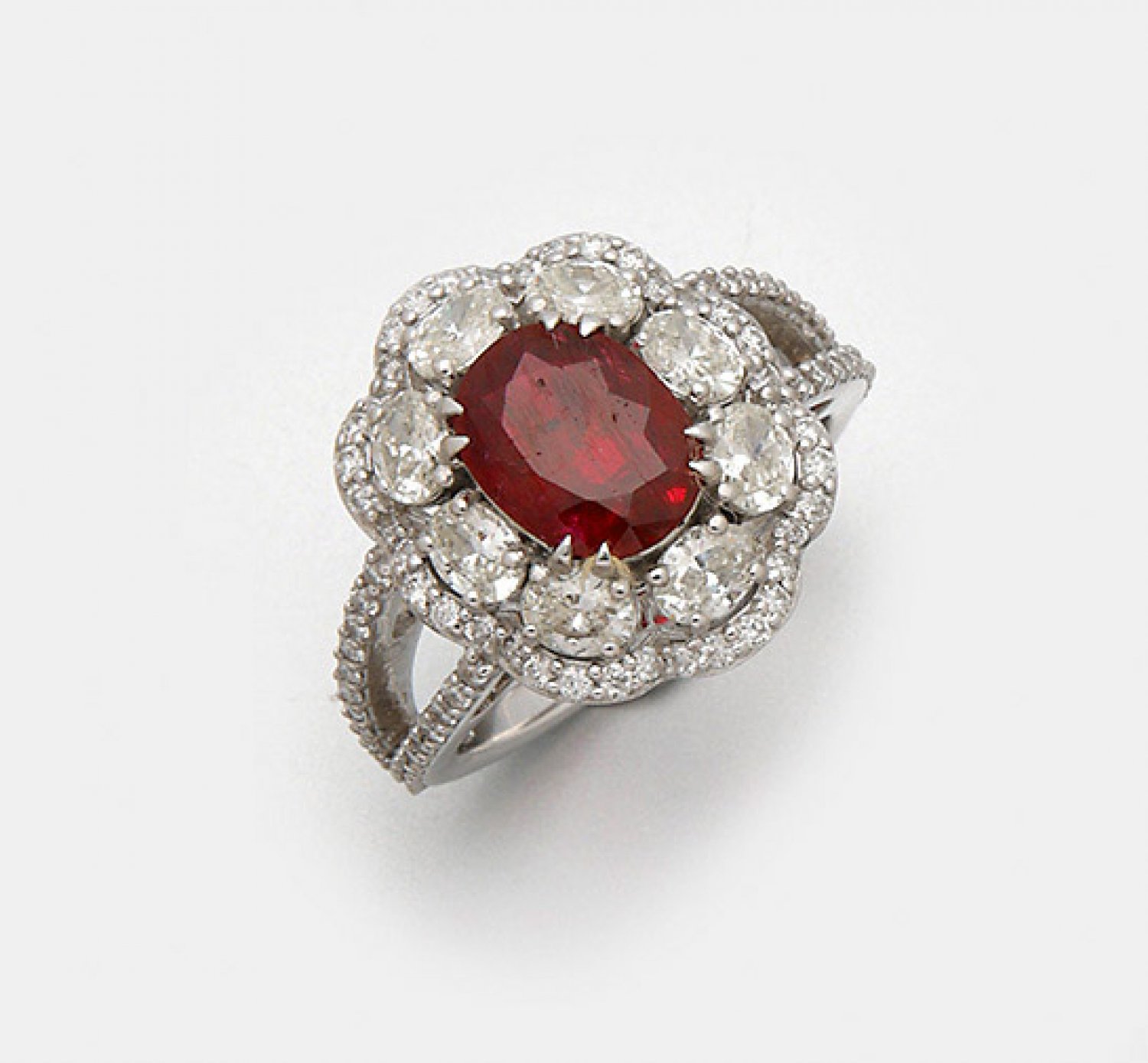 Hochfeiner unbehandelter Burma-Rubinring Weißgold, gest. 750. Zentral besetzt mit einem transparenten taubenblutroten Rubin von ca. 2,22 ct. im Ovalschliff, entouriert von Diamanten von zus. ca. 1,85 ct. (M/si-pi). Gew. ca. 6,33 g.