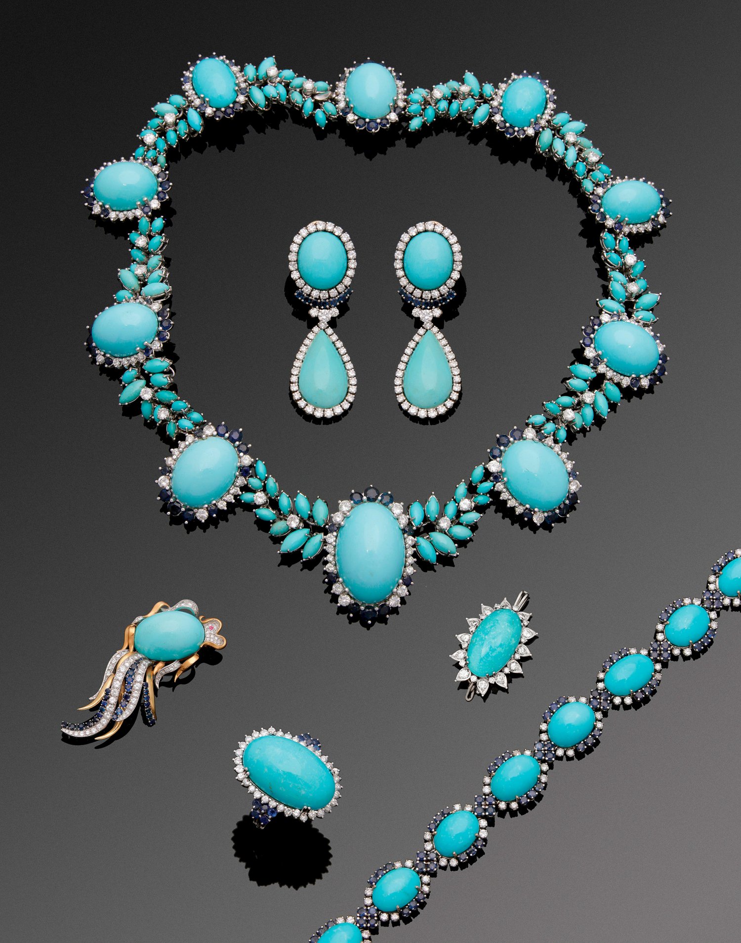Prachtvolles Türkis-Parure 6-tlg.; Weißgold, gest. 750. Collier besetzt mit 10 Türkisen im Cabochonschliff von ca. 51 g., entouriert von 144 Brillanten von zus. ca. 16 ct. (F-G-I/if-vsi), 100 nahezu kornblumenblauen Saphiren von zus. ca. 30 ct. sowie 112 kleinen Türkisnavetten. Das korrespondierende Armband besetzt mit 8 Türkiscabochons von ca. 13 g., entouriert von 64 Brillanten 3,20 ct. (I/si) sowie 80 Saphiren von zus. ca. 8,00 ct.; Ring zentral besetzt mit einem Türkiscabochon von ca. 7 g., entouriert von 34 Brillanten von zus. ca. 1,36 ct. (F-G/si) und 10 Saphiren von zus. ca. 1,00 ct.; Korrespondierende Paradiesvogel-Brosche besetzt mit einem Türkis von ca. 25 g., ausgefasst mit 77 Brillanten von zus. ca. 7,86 ct. (H/if-vsi), 27 Saphiren von zus. ca. 4,90 ct.; Korrespondierende kleine Brosche besetzt mit einem Türkiscabochon von ca. 4,7 g., entouriert von 24 Brillanten von zus. ca. 2,28 ct. (F-G/if-vvsi). Paar korrespondierende Ohrgehänge besetzt mit 4 Türkiscabochons von zus. ca. 8 g, entouriert von 104 Brillanten von zus. ca. 5,56 ct. (F-G/if-vvsi) und 14 Saphiren von zus. ca. 1,40 ct.