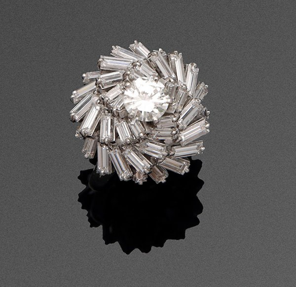 Glamouröser hochqualitätvoller Brillant-Solitärring Platin, gest. 950. Zentral besetzt mit einem Brillanten von ca. 1,10 ct. (F-G/if-vvs), entouriert von insges. 40 Diamantbaguetten von zus. ca. 4,00 ct. (F-G/if-vvs). Gew. ca. 17,33 g.