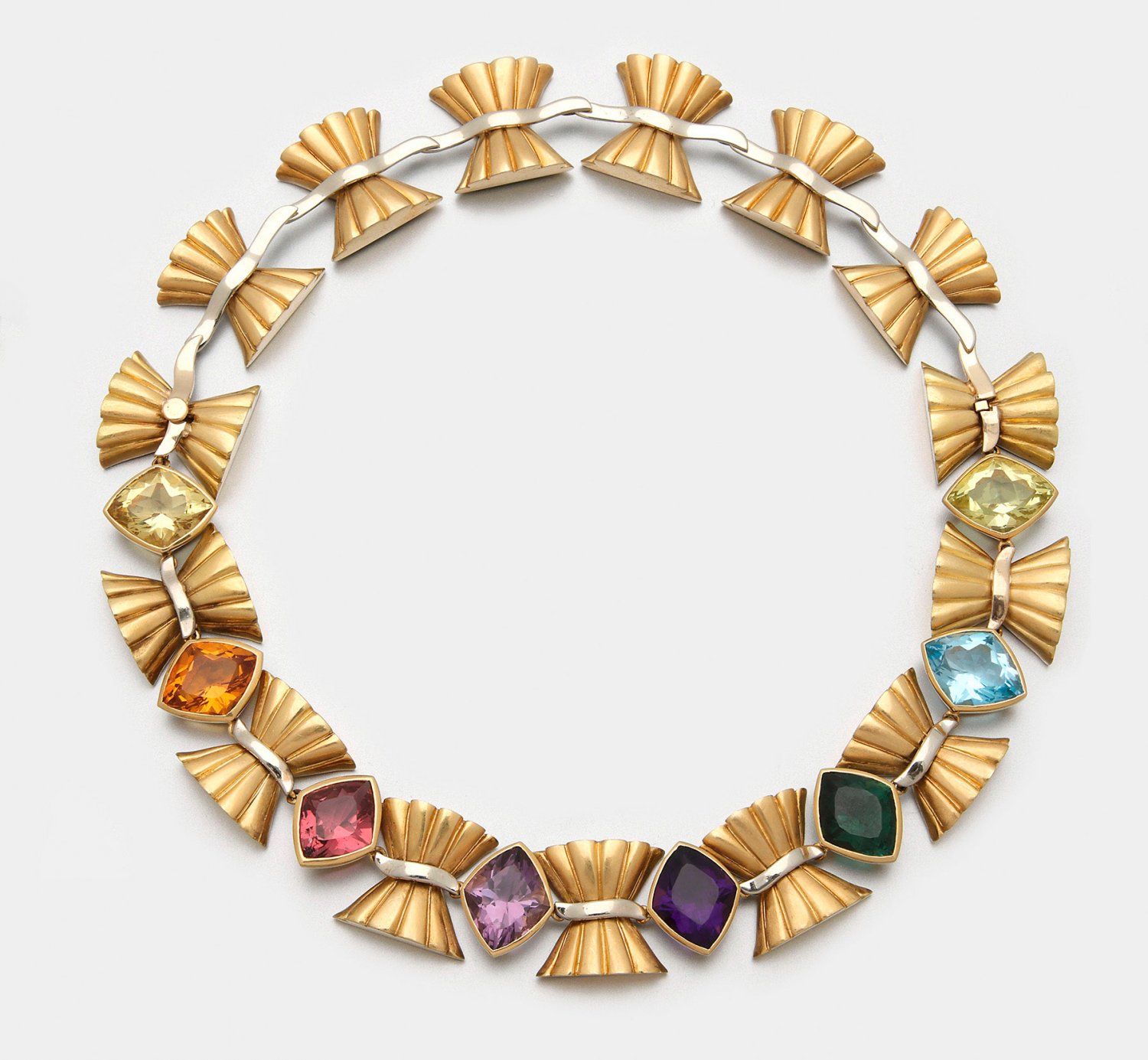 Charmantes Multicolor-Collier aus den 60er Jahren Gelb- und Roségold, gest. 750. Schauseitig besetzt mit einem himmelblauen Topas, einem goldgelben sowie orangegoldenen Citrin, einem pfirsichfarbenen Turmalin und einem fliederfarbenen sowie tiefvioletten Amethyst im Rautenschliff. Gew. ca. 172,60 g. Sehr feine Goldschmiedeausführung.