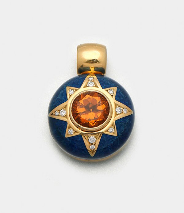 Citrin-Anhänger von Victor Mayer aus der Kollektion "Fabergé". Gelbgold, teilw. royalblau emailliert, gest. 750. Stark bombierter, fein guillochierter Anhänger, zentral besetzt mit einem orangegelben Citrin von ca. 4,00 ct., entouriert von kleinen Brillanten. Herstellerzeichen. Gew. ca. 20,64 g.