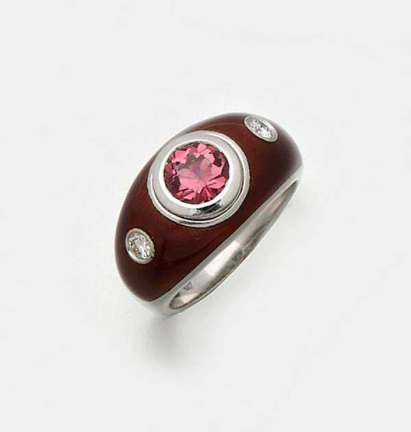 Turmalin-Bandring von Victor Mayer aus der Kollektion "Fabergé". Weißgold, teilw. bordeauxrot emailliert. gest. 750. Stark bombierte, leicht verlaufende Ringschiene, zentral besetzt mit einem dunkelpinkfarbenen Turmalin von ca. 1,00 ct., flankiert von zwei Brillanten von zus. ca. 0,20 ct. (G/vs). Herstellerzeichen. Gew. ca. 13,83 g.