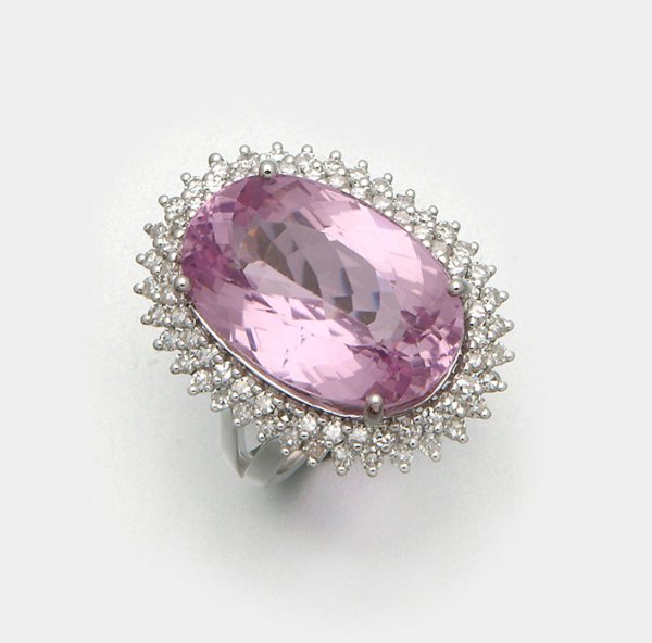 Großer brasilianischer Kunzitring mit Brillanten Weißgold, gest. 750. Zentral besetzt mit einem purpurfarbenen Kunzit im Ovalschliff von ca. 16,50 ct., entouriert von Brillanten von zus. ca. 1,02 ct. (G-H/vs). Gew. ca. 11,51 g.