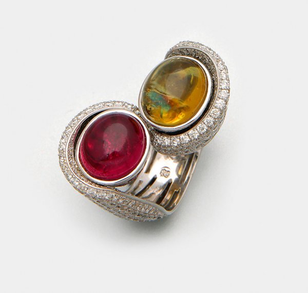 Extravaganter Turmalinring Weißgold, gest. 750. Diagonal besetzt mit einem pinkfarbenen und einem limonenfarbenen sog. Wassermelonen-Turmalin im Cabochonschliff von zus. ca. 8,00 ct. und diversen Brillanten von zus. ca. 10,55 ct. (top wesselton(F-G)/vvs) in Pavéfassung. Gew. ca. 34,82 g.
