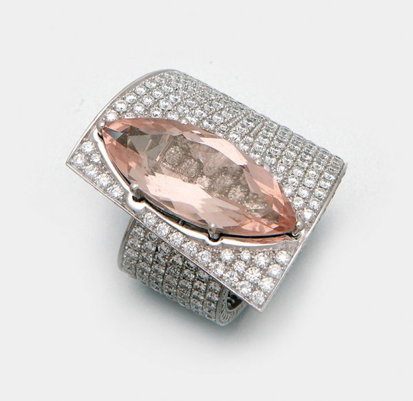 Extravaganter Marquisering Weißgold, gest. 750. Stark verlaufende Bandform, schauseitig besetzt mit diversen Diamanten von zus. ca. 10,01 ct. (top (wesselton(G)/vs) in Pavéfassung. Bekrönt von einem pfirsichfarbenen Morganit im Marquiseschliff von ca. 20 ct.; Gew. ca. 33,83 g.