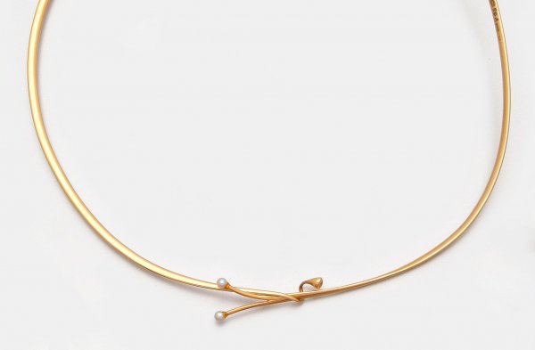 Halsreif mit Perlen von Vivianna Torun für Georg Jensen Gelbgold, gest 750. Flacher, leicht geschwungener Reif, die Enden mit jeweils einer Perle besetzt. Künstler-Sign. Herstellerzeichen. Ref.-Nr. 904. Gew. ca.