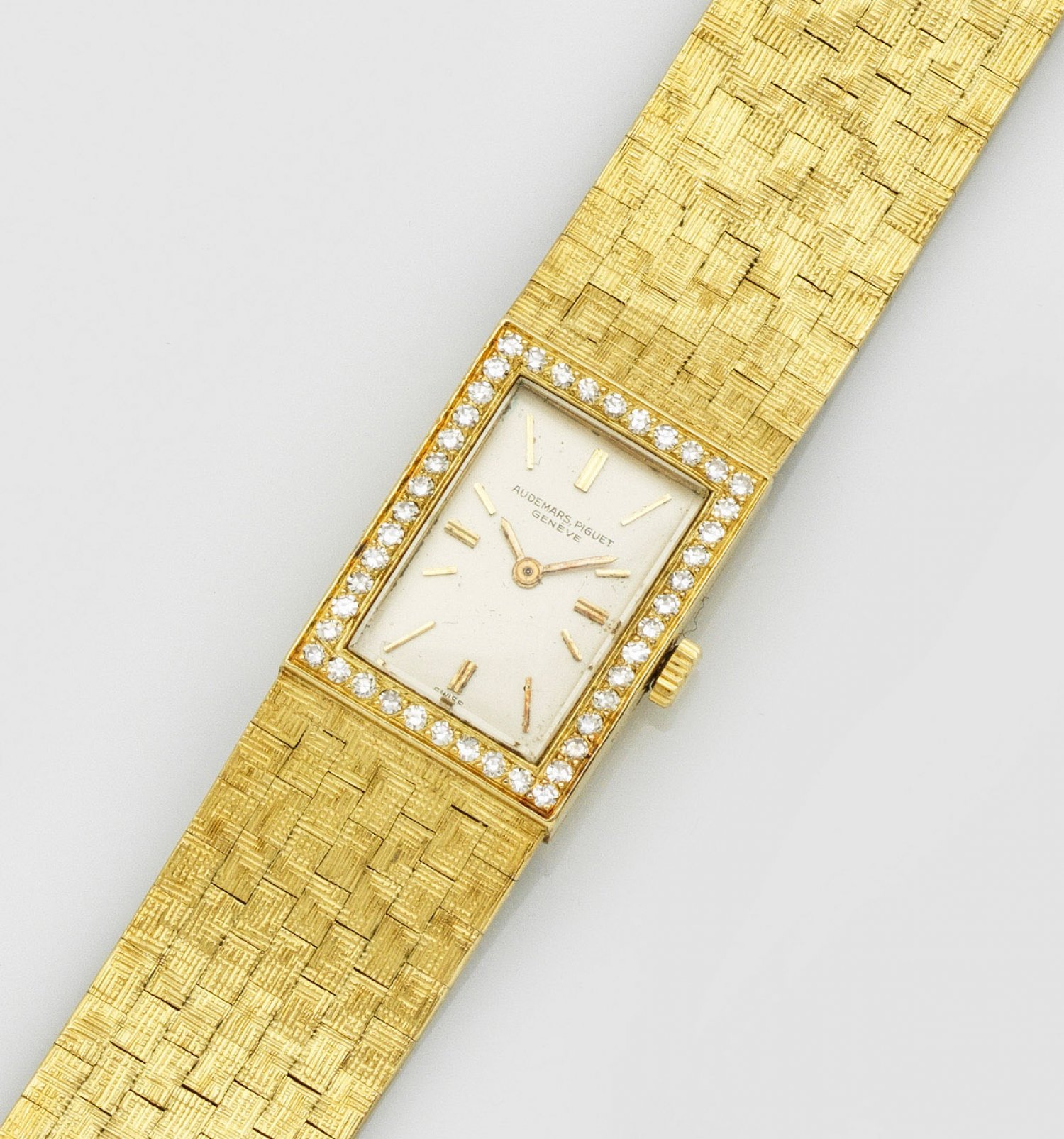 Damenarmbanduhr von Audemars Piguet aus den 50er Jahren Gelbgold, gest. 750. Tankförmiges Uhrengehäuse, Lunette umlaufend mit Diamanten besetzt, übergehendes Milanese-Armband mit Faltschließe. Mechanisches Werk mit Handaufzug. Gew. ca. 42,94 g.