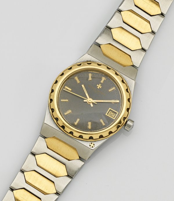 Herrenarmbanduhr Vacheron & Constantin aus den 80er Jahren aus der Kollektion Overseas "Modell 222". Stahl/18 ct. Gold. Rundes Uhrengehäuse mit zahnradförmiger Lunette, grau patiniertes Zifferblatt, Stabindexe und Zeiger mit Tritiumauflage, Datumsanzeige. Leicht verlaufendes Gliederarmband mit doppelter Faltschließe. Automatikwerk. Ref.-Nr. 557997.