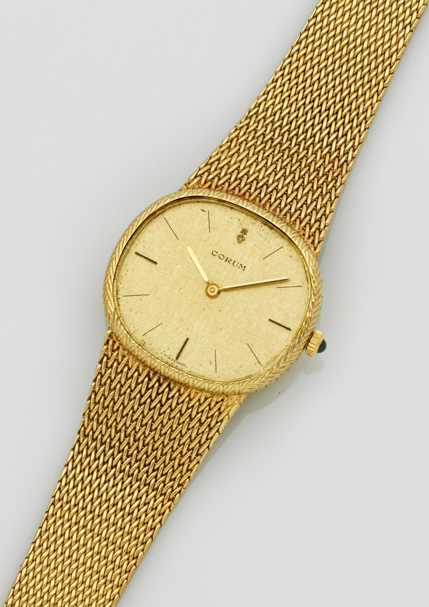 Herren-Armbanduhr von CORUM aus den 80er Jahren Gelbgold, gest. 750. Tonneauförmiges Uhrengehäuse, satiniertes Zifferblatt mit Stabindexen und Zeigern. Leicht verlaufendes Milanese-Armband mit Faltschließe. Mechanisches Werk mit Handaufzug, Krone mit Saphircabochon besetzt. Gew. ca. 98,33 g.