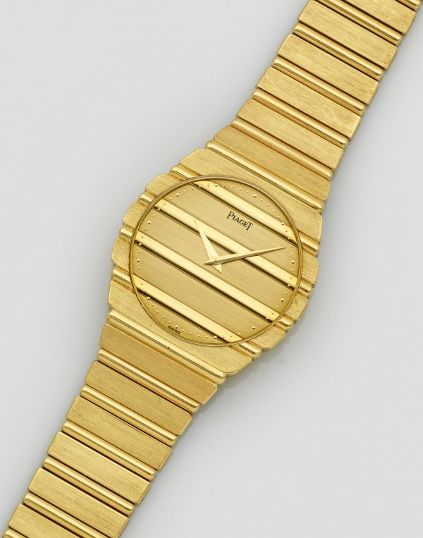 Herrenarmbanduhr von Piaget "Polo" aus den 80er Jahren Gelbgold, gest. 750. Rundes Zifferblatt mit Goldindexen und Lanzenzeigern, übergehendes leicht verlaufendes Armband aus satinierten und polierten Gliedern mit Faltschließe. Quarzwerk. Herstellerzeichen. Ref.-Nr. 761C701, 401657. Gew. ca. 143,81 g.