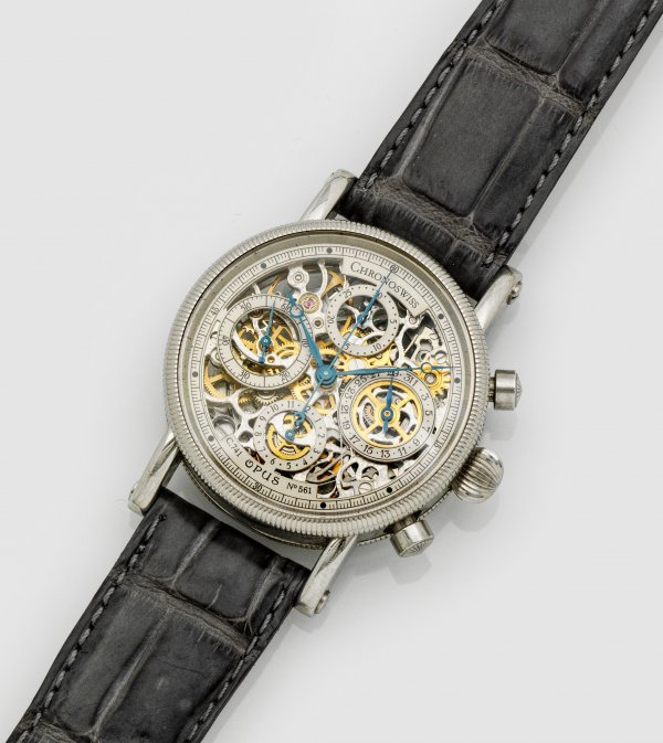 Limitierte Herrenarmbanduhr von Chronoswiss von 1996 Stahl. Rundes, beidseitig verglastes Uhrengehäuse, fein geriffelte Lunette, skelettiertes Zifferblatt. Hellgraues Krokodillederarmband mit Stiftschließe. Automatikwerk mit Chronograph, Kaliber 741. Saphirglas. Originales Holzetui und Garantieheft.