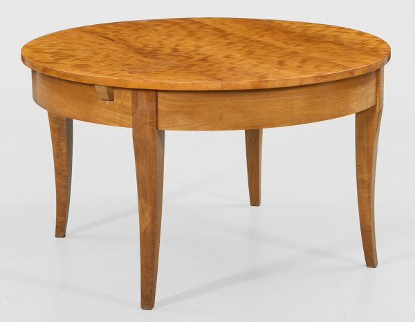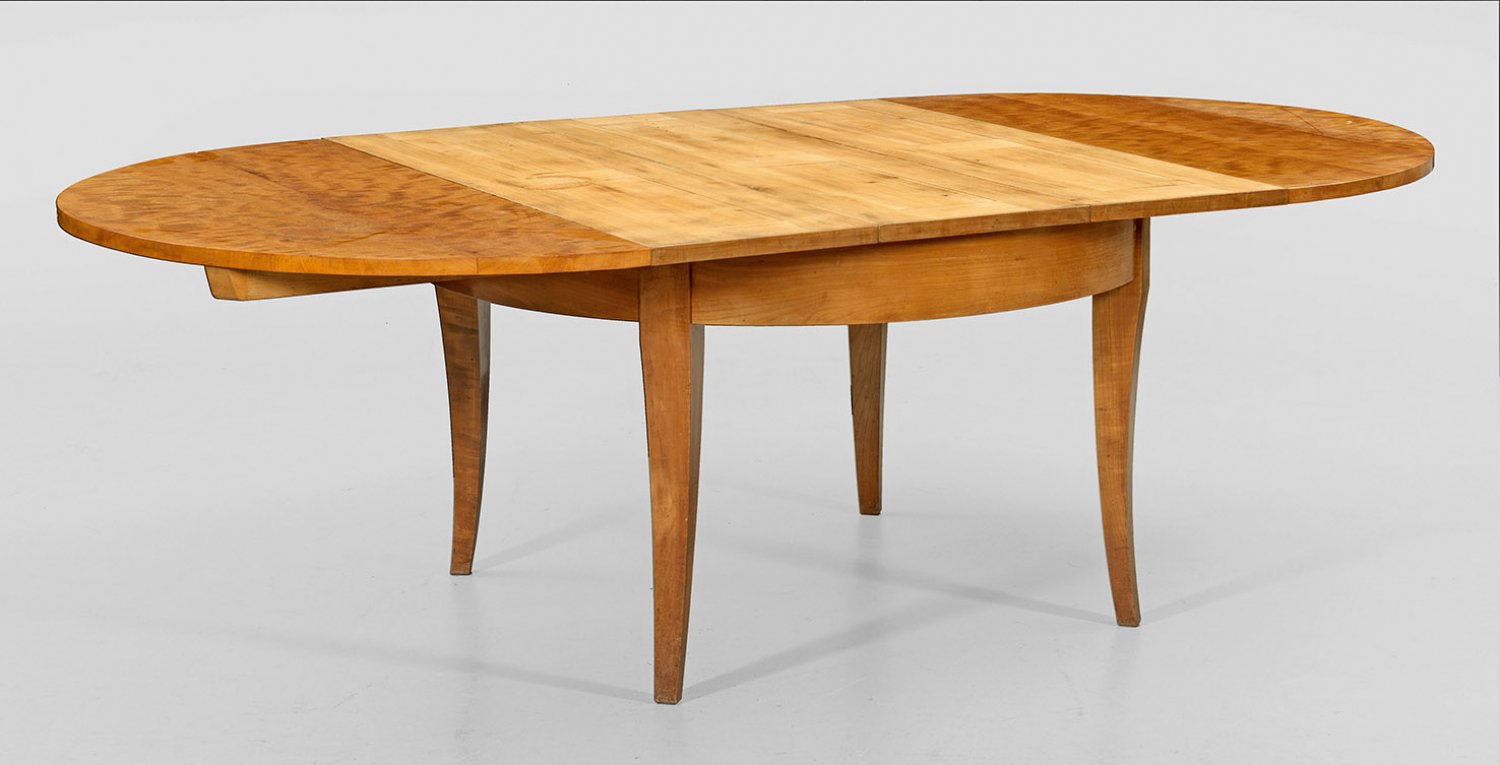 Biedermeier-Ausziehtisch Kirschbaum, furniert. Bombierte Zarge aus gebogten, sich konisch verjüngenden Vierkantbeinen. Gering überstehende, ausziehbare Deckplatte. Dazu drei unfurnierte Einlegeplatten. H. 73,5 cm 128 cm x 126/237 cm.