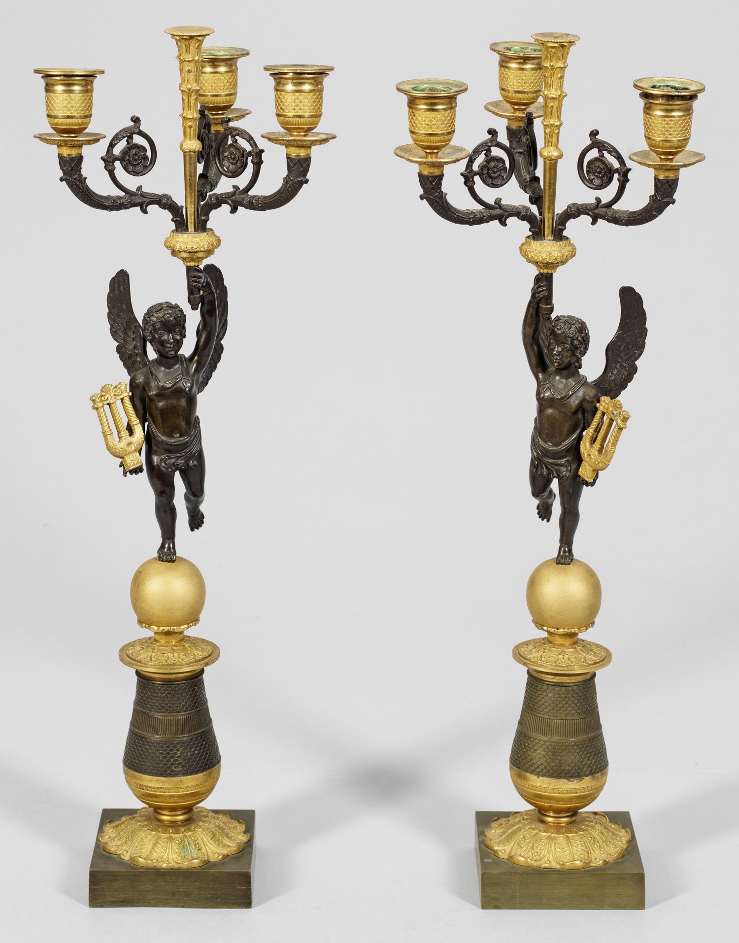 Paar große Empire-Girandolen Gegenstücke. 3-flg.; Bronze, dunkel patiniert und teilw. vergoldet. Über quadratischer Plinthe mehrfach gegliederter, blattreliefierter Balusterschaft mit Schuppendekor als Träger für Kugelelement. Oberhalb davon ausgehend vollplastische Darstellungen von Amorknaben mit Lyra als Träger für Girandolenelement aus geschwungenen Leuchterarmen aus eingerollten Blattvoluten. Vasenförmige Tüllen. H. 54,5 cm.
