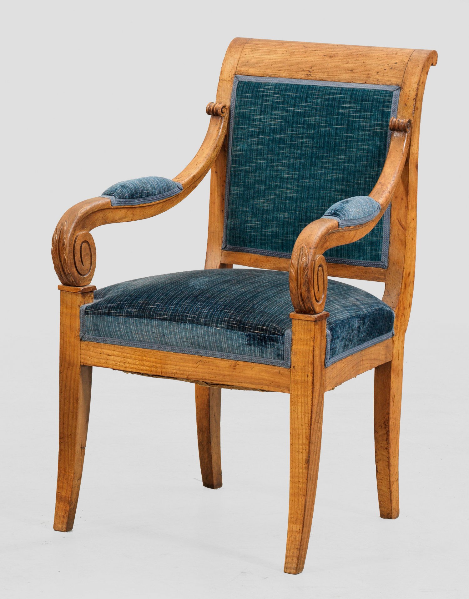 Biedermeier-Armlehnsessel Kirschbaum. Trapezförmige Zarge auf leicht ausgestellten, konischen Vierkantbeinen. Geschweift ansteigende Armlehnen aus eingerollten Voluten sowie rechteckige, leicht zurückschwingende Rückenlehnenrahmung. Gepolstert und bezogen. H. 90 cm. 54 cm x 56 cm. Sitz-H. 48 cm.