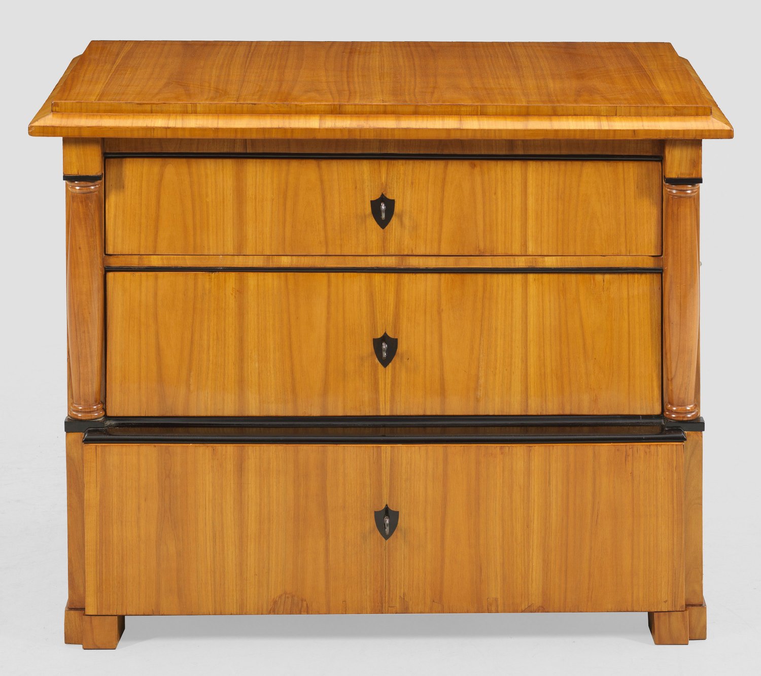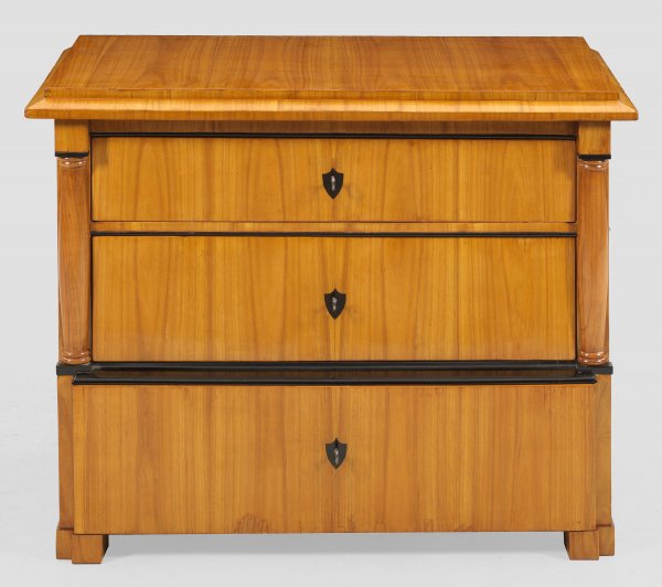 Biedermeier-Kommode Kirschbaum, furniert und teilw. ebonisiert. Gerader, rechteckiger Korpus auf gekanteten Füßen. In der gegliederten Front drei Schubladen unterschiedlicher Größe, teilw. flankiert von eingestellten Halbsäulen. Gestuft ansteigende Deckplatte. Rest. mit Erg.; H. 81 cm. 102 cm x 56,5 cm.