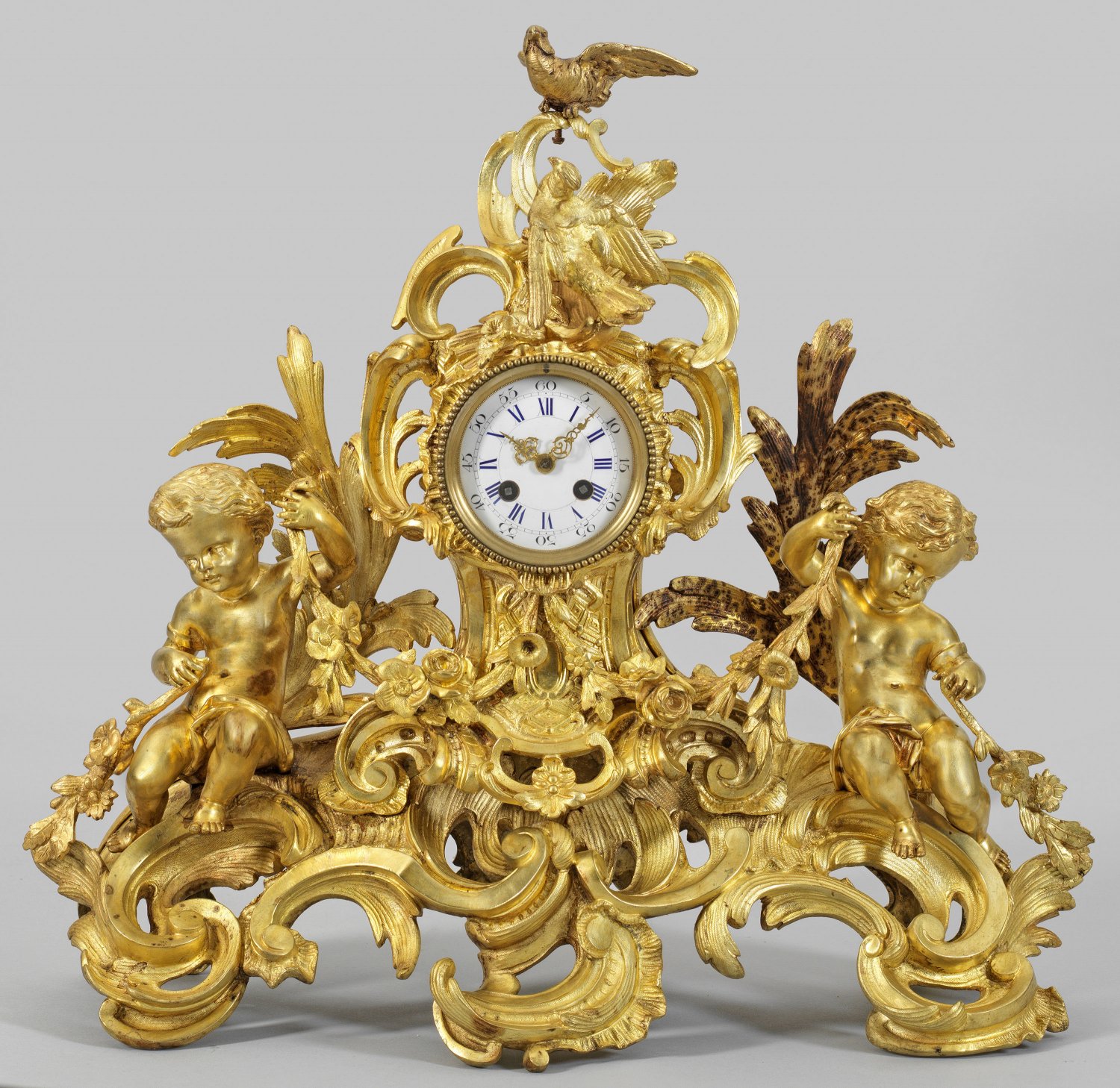 Große Belle Epoque-Pendule Bronze, vergoldet. Durchbrochen gestaltetes Uhrengehäuse aus üppigen Voluten, flankiert von zwei vollplastisch gestalteten Putten sowie Bekrönung in Form eines Papageienpaares. Verglastes Zifferblatt sowie Pendulenwerk mit Pendelfeder und Halbstundenschlag auf Glocke. Altersspuren. Überholungsbedürftig. H. 52 cm. 55 cm x 22 cm.