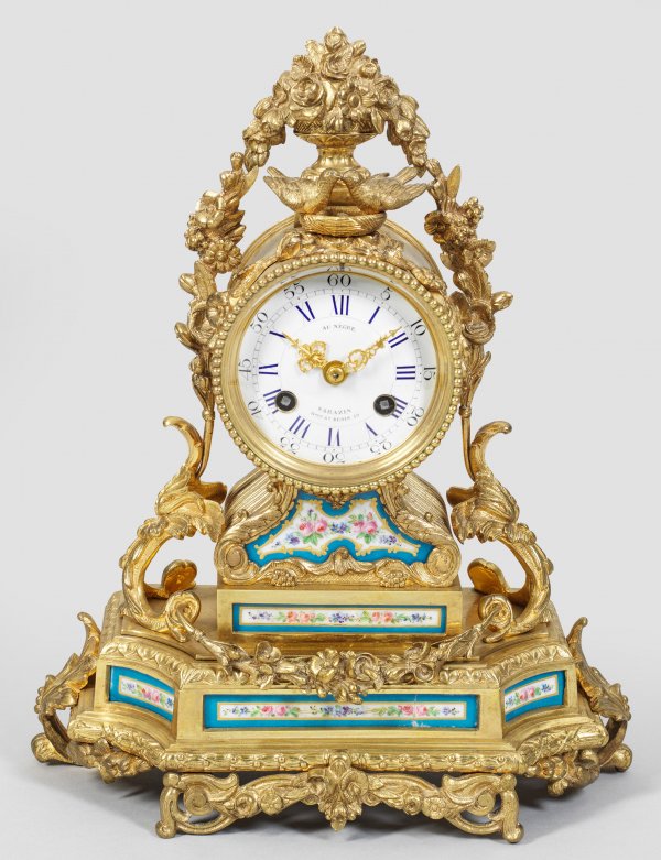 Napoleon III-Pendule Bronze, vergoldet sowie polychrom gestaltete Porzellanplaketten. Balusterförmiger Korpus, flankiert von Rocaillespangen auf profilgerahmtem Podestsockel und Volutenfüßen. Schauseitig eingelassene Plaketten mit Blütendekor, teilw. besch.; Vasenförmiger oberer Abschluss sowie Bekrönung in Form eines schnäbelnden Taubenpaares mit Nest. Verglastes Emailzifferblatt, bez. Sarazin aus Nègre. Pendulenwerk mit Pendelfeder sowie Halbstundenschlag auf Glocke. H. 34,5 cm. 27 cm x 13 cm.