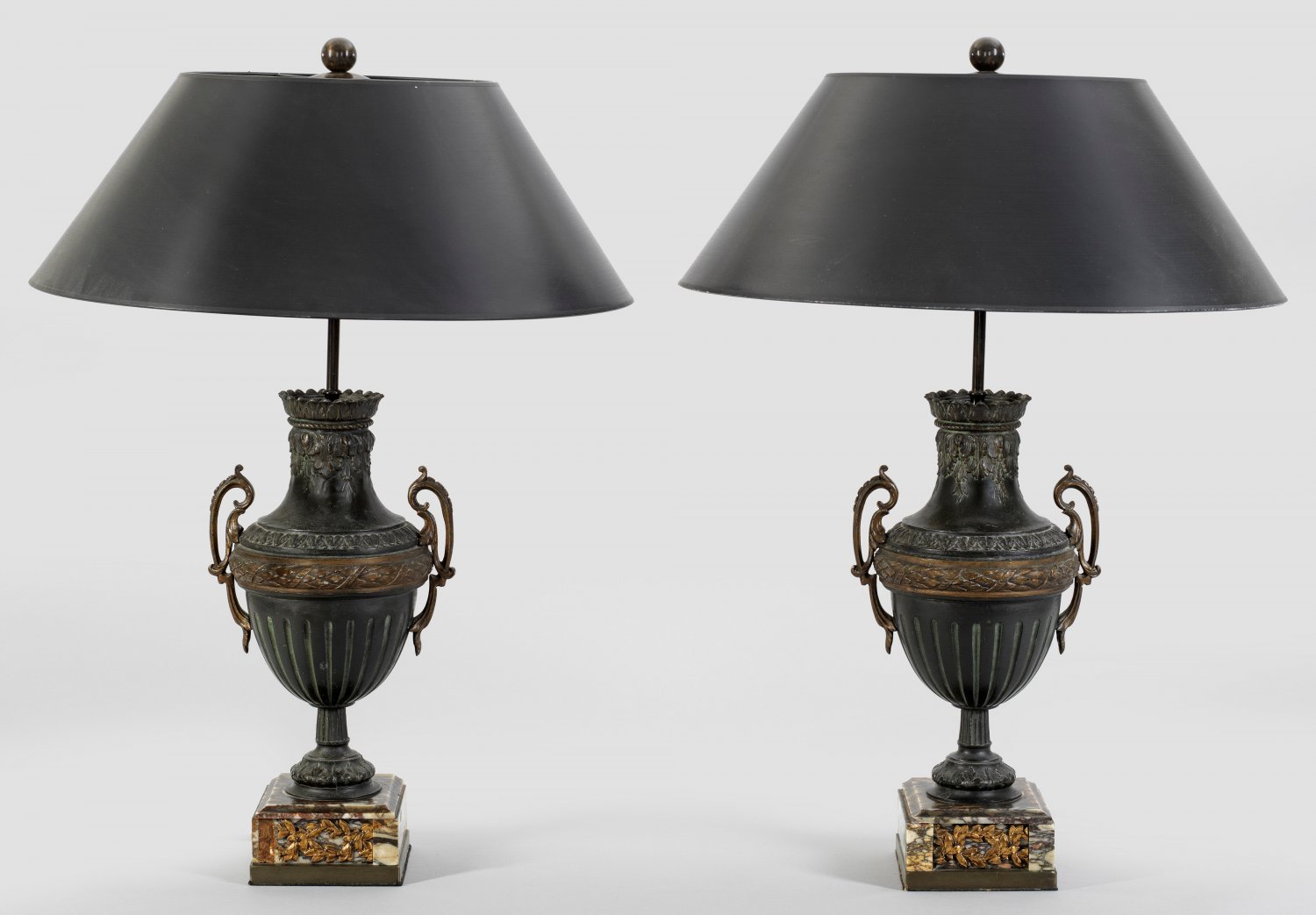 Paar Tischlampen im Louis XVI-Stil 2-flg.; Zinkguss, patiniert sowie bordeauxrot-beigefarbener Marmor. Balusterförmiger, kannelierter Korpus mit breitem Fries aus Lorbeern, flankiert von Volutenhenkeln auf profiliertem Sockel. Oberhalb schlanker Schaft als Träger für Leuchtmittel. Konischer Lampenschirm. Elektrifiziert. H. 70 cm.